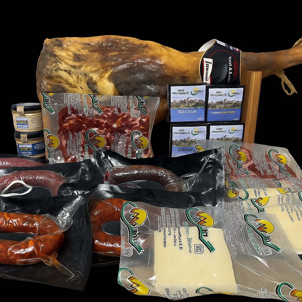 - 2 morcillas Patateras Ibéricas: Producto típico de nuestra Localidad, es uno de nuestros productos estrellas, nuestra famosa Morcilla Patatera Ibérica. Elaborada a base de patata, magro y especias, su textura permite que pueda ser consumida en rodajas o untada en pan, como aperitivo o en bocadillos. Peso aprox. 250 gr./u.
