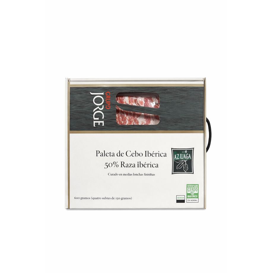 Selección de paleta de cebo ibérica 50% raza ibérica, cuidadosamente curada y presentada en prácticas medias lonchas finísimas para conservar todo su aroma, jugosidad y sabor tradicional.